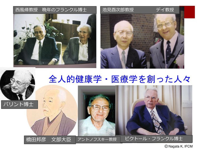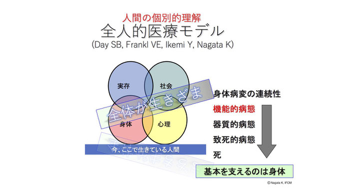 患者さんは全人的に生きています。細胞や臓器単独で生きているのではありません。人間の生きざまとは、患者さん固有の身体(からだ)・心理(こころ)・社会(環境)・実存(生きがい)の総体です。身体・心理・社会・実存的医療モデルは、WHO(世界保健機関)のデイ教授、ロチェスター大学のエンゲル教授、九州大学の池見酉次郎教授、ウイーン大学のフランクル教授の考え方に私たちの考え方を導入してようやく完成しました。