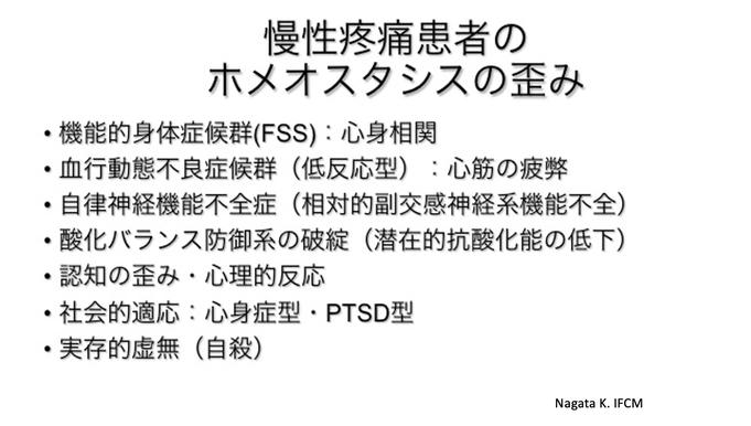 しかし、一般に、線維筋痛症は原因不明とよく言われます。それは、原因が、1ヶ所の細胞、臓器にはないからです。実は、その患者さん固有の生き様のゆがみにあるからです。生き様とは、患者さん固有の身体(からだ)・心理(こころ)・社会(環境)・実存(生き甲斐)要件の集合です。
